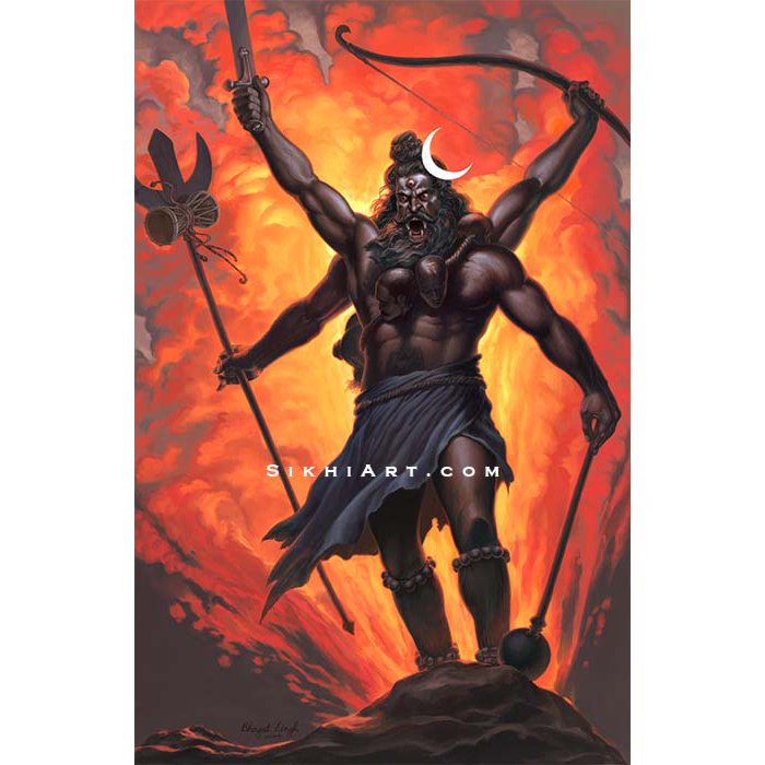 In this painting, Bhagat paints a Symbol of Time and Death inspired by the compositions of Dasam Granth. It is known as Mahakala, Shri Kaal, or Kala Bhairava.